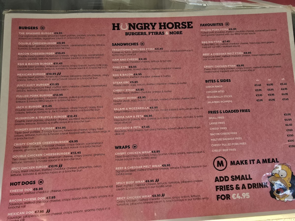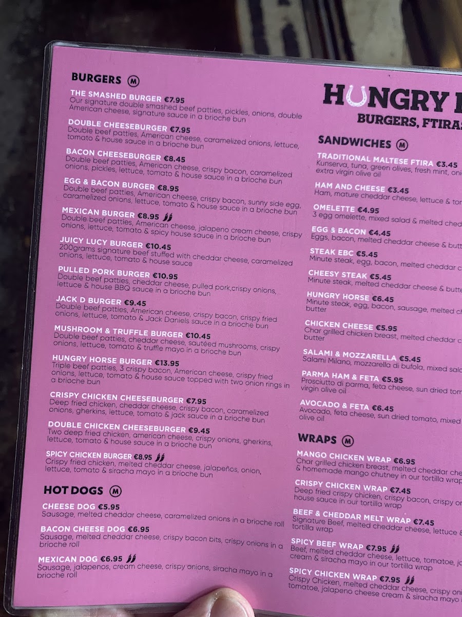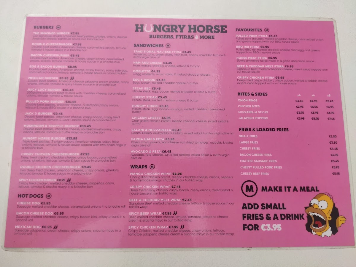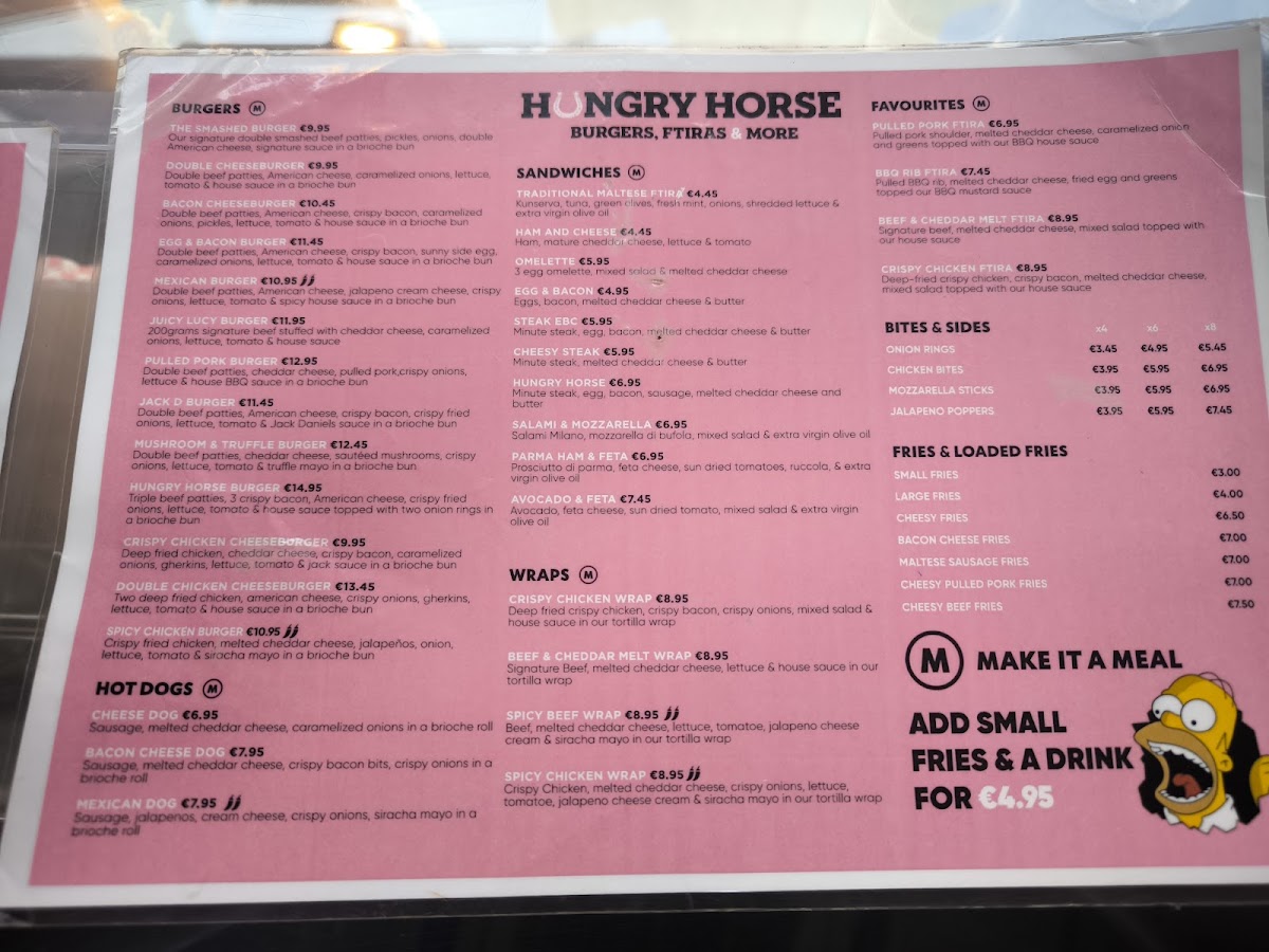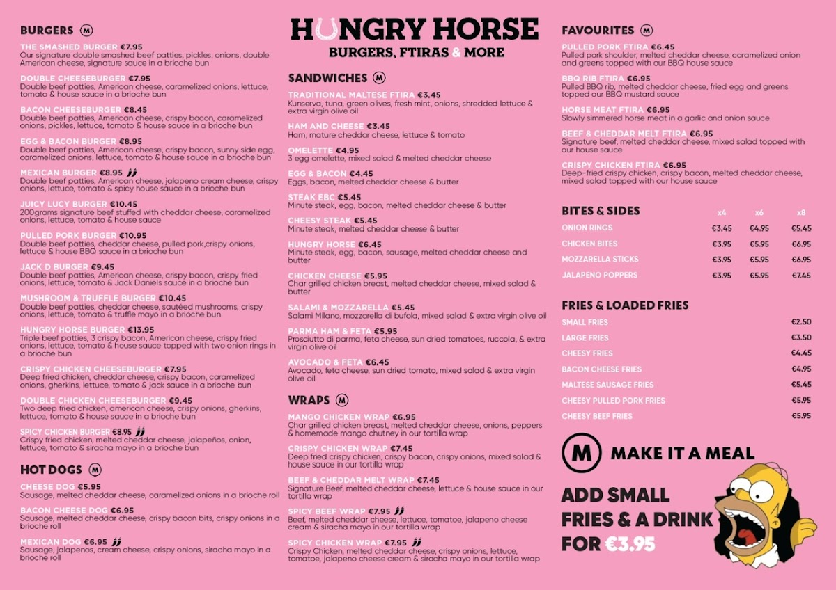 Right in the heart of Ross Street in St Julian’s, STJ 3243, Malta, the Smash Burgers By Hungry Horse Menu is the kind of lineup you check out when you’re seriously craving something bold and satisfying. This isn’t about tiny, delicate bites - it’s about juicy smashed patties with crispy edges, layered in soft buns that somehow hold everything together without stealing the spotlight.