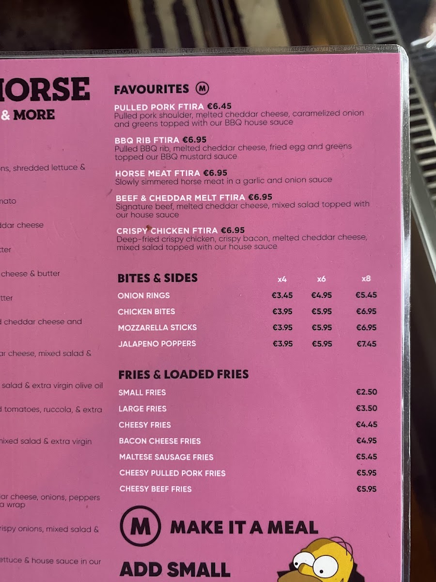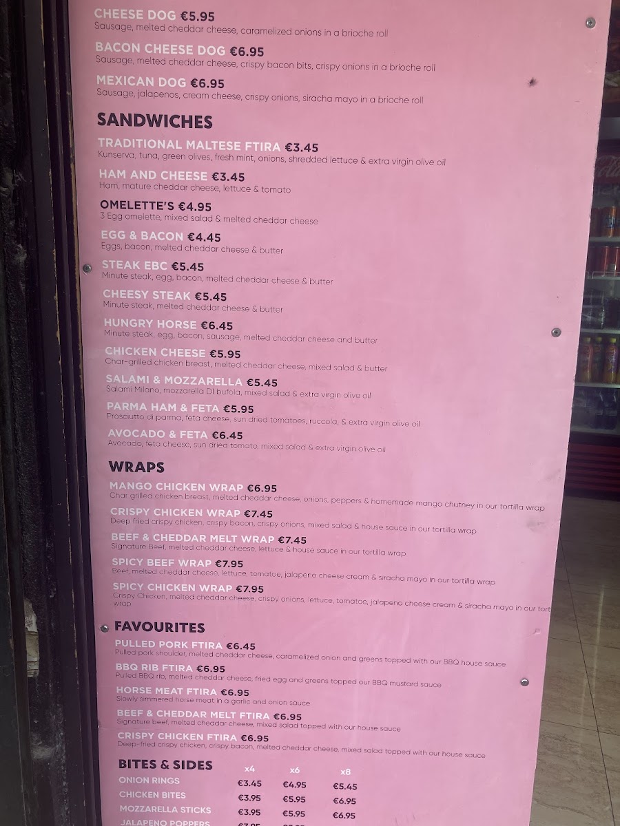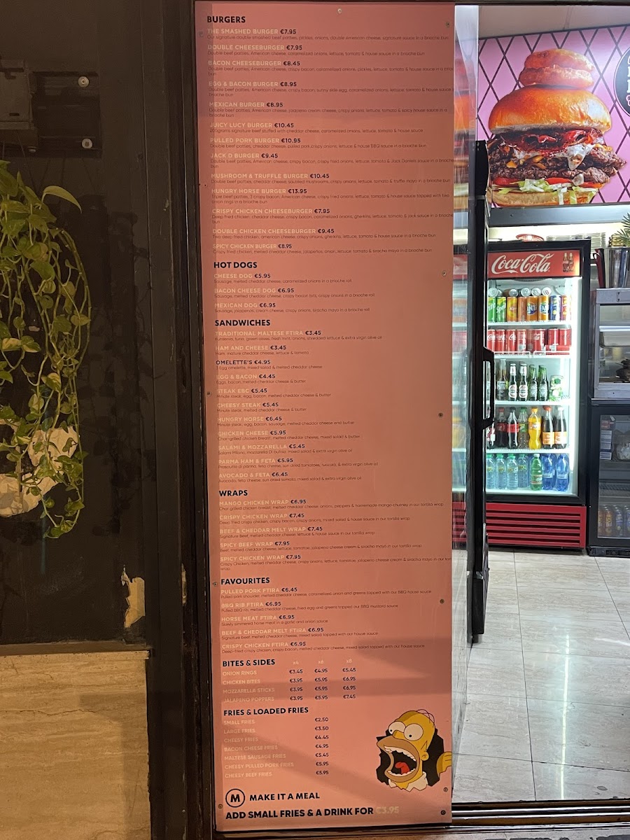What stands out straight away is the variety. From classic cheeseburgers done properly to loaded creations stacked with sauces, pickles, and melty cheese, every option feels built for real burger fans. Then there are the sides - golden fries, probably impossible to share, and extras that turn a quick bite into a full-on feast. It’s the kind of menu you scroll through slowly because everything sounds like exactly what you’re in the mood for, whether you’re grabbing a casual dinner with friends or refueling after a long day exploring St Julian’s.